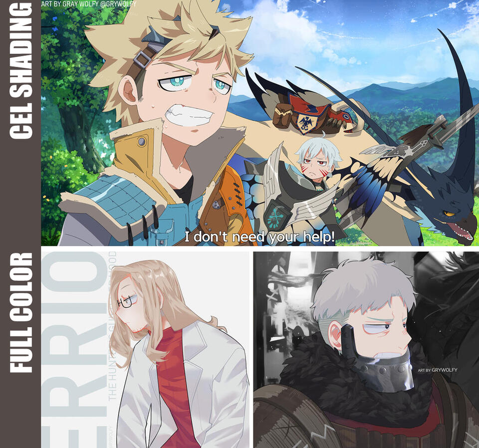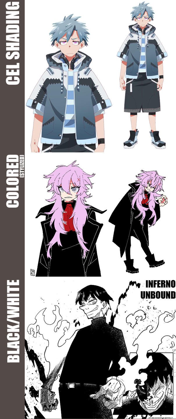 Colored sketches, black and white, cel shaded, full colored illustrations and manga pages